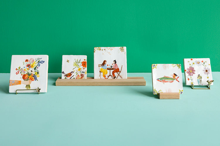 Tegels kunnen niet alleen worden opgehangen, maar ook worden neergezet met een tegelhouder. Denk aan plekken zoals de vensterbank, boekenkast of side table. Doordat de accessoires zowel in hout als in goud verkrijgbaar zijn, kun je zelf bepalen wat het beste combineert met jouw interieur. Een tegelhouder benadrukt de afbeelding en geeft een ander effect dan ophangen. Wanneer je tegeltje in een houder staat, trekt het extra aandacht tussen andere objecten in huis. Combineer de tegels met elkaar en hang er een paar in een groepje op, eventueel met een wandplankje erbij. Heb je een serie tegels die goed bij elkaar past of tegels die horen bij bepaalde belangrijke momenten in je leven, zoals geboortetegels, dan is de Family Holder weer een juiste keuze.
